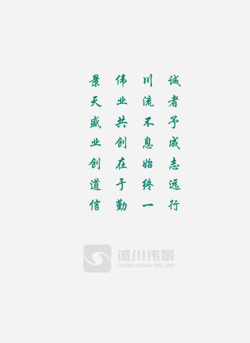诚 之 为 名,寓 意 公 司 以 诚 信 为 本,成 人 之 美、成 己 之 业,更 代 表 立 信 果 行、去 伪 存 真、善 作 善 成 的 敬 业 精 神 和 作 风 态 度。《 礼 记·中 庸 》 :“诚 者 自 成 也”,诚 川 伟 景 将 始 终 坚 持 以 诚 立 身、 以 诚 兴 业、以 诚 感 人 的 态 度,全 力 打 造 优 质 服 务,让 客 户 满 意,得 社 会 赞 誉,树 行 业 标 杆。